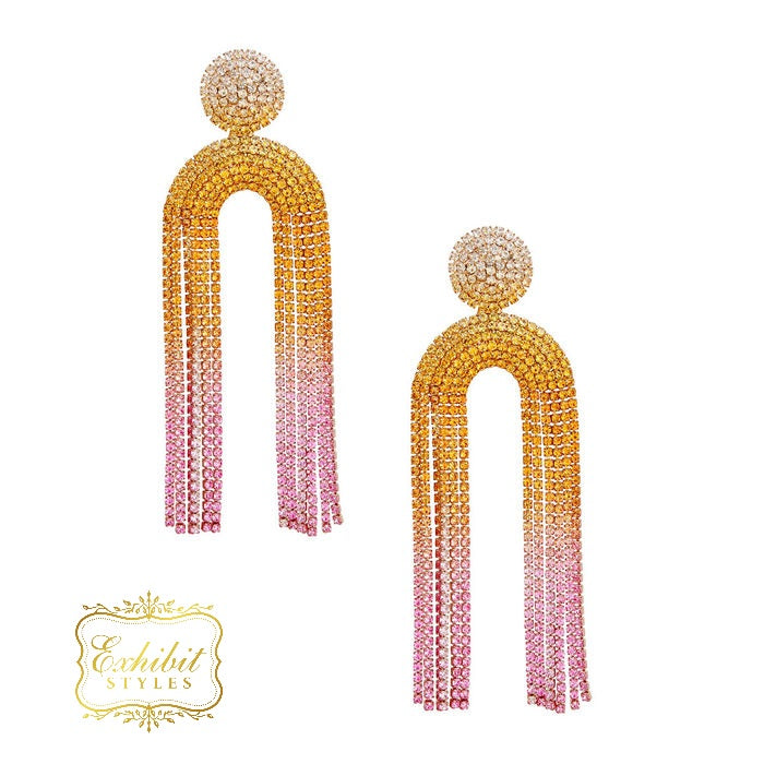 Long Fringe Earrings with Pave Rhinestones Round Stud Earrings with Drop Arched Fringe Tassel Detail. Post Backing. Dimensions: 4.25 x 1.5 inches.